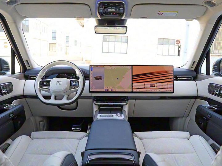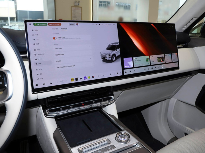 内饰方面,车内配备1680万色流光溢彩氛围灯,支持256色光谱深度调校。整车提供了14处北欧天然真木饰板,Soft NAPPA全粒面头层真皮覆盖全车三排座椅的靠背、座垫、中央扶手、门板局部等位置。麂皮绒包覆顶棚由8位匠人390分钟手作绷制。车机系统采用16英寸3.5K OLED双联屏,包括中控屏和副驾屏,匹配Zeekr AI OS 7智能座舱操作系统。